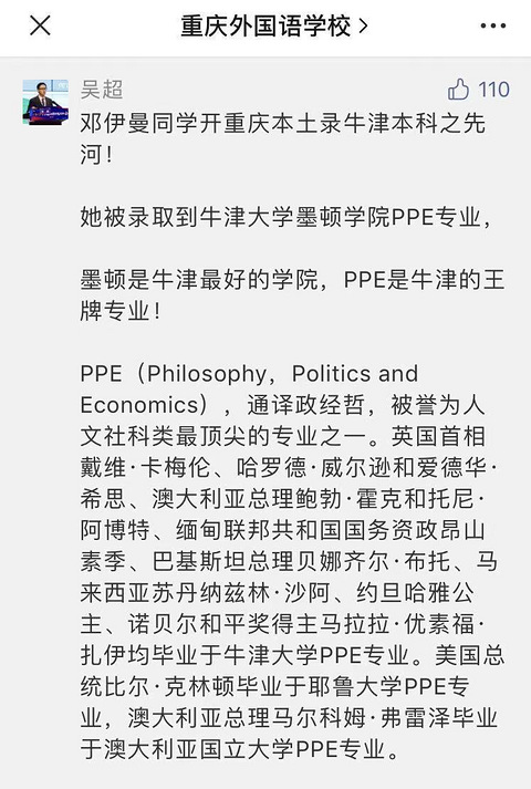 重庆本土录牛津本科之先河,墨顿学院PPE专业,不懂的去baidu一下。。。