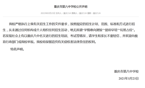 重庆八中发布公开声明,按照规定的招生计划、范围、标准和方式进行招生,从未通过任何机构或个人组织任何招生活动,绝无所谓“学情意向测验”“提前早培”“坑班占位”。若发现社会上有以重庆八中名义进行的招生培训、考试等情况,请学生和家长不要轻信,并欢迎向教育行政部门或我校举报。