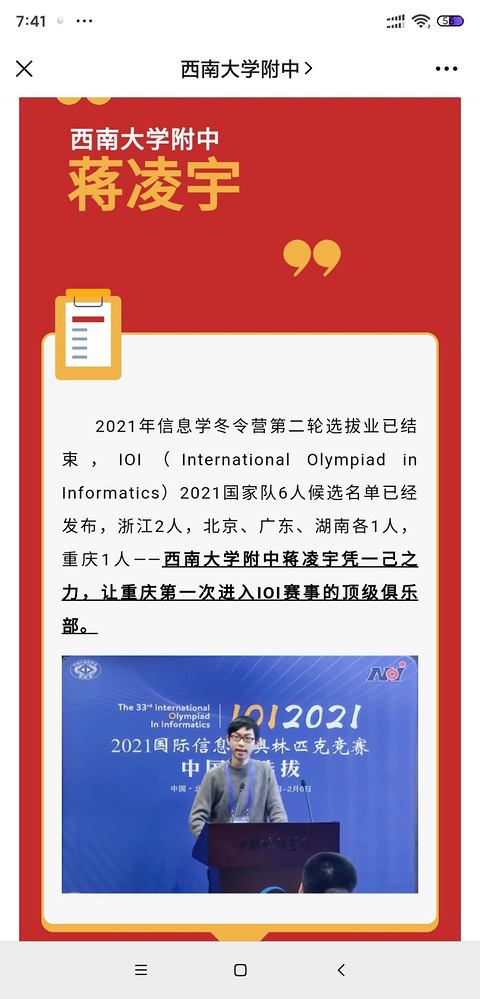 2021年信息学冬令营第二轮选拔业已结束,IOI(International Olympiad in Informatics)2021国家队6人候选名单已经发布,浙江2人,北京、广东、湖南各1人,重庆1人西南大学附中蒋凌宇凭一己之力,让重庆第一次进入IOI赛事的顶级俱乐部。