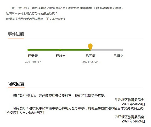 早前有网友在重庆网络问政咨询沙坪坝教委关于“名校联中” 和位于“南渝中学”是否转公,现在沙坪坝教委已明确回复转公办了!加上之前宣布转公的树人八中(阳光校区)、树人凤天。沙坪坝涉及公参民的4所学校已全部转公办了。
