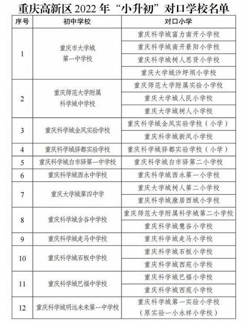 2022年高新区小升初对口学校名单?高新区小学的对口中学名单? 2022年高新区中小学招生政策出炉,随之而来的小升初对口学校名单也出来了。对比2021年的招生政策,大学城第一中学的对口小学新增大学城沙坪坝小学。 相关阅读:重庆2022年小学招生政策,重庆各区2022年幼升小招生通知