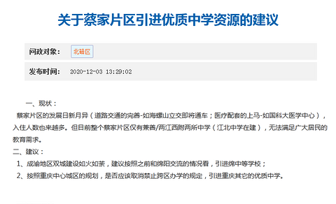 蔡家网友提议取消禁止跨区办学的规定,引进绵中等优质中学