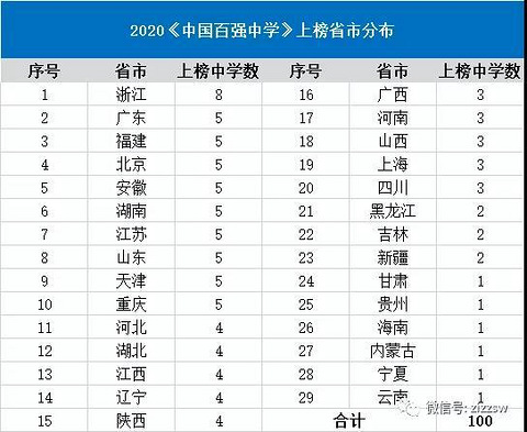 2020全国百强高中榜单发布!重庆5所上榜! 1、除西藏、青海外,其余29个省市自治区均有高中上榜。从各省高中入选数量来看,浙江以入选8所的数量领先于其他各省份;4个直辖市中,除上海有3所入围外,北京、天津、重庆都有5所高中上榜;其他排名靠前的广东、江苏、山东、湖南、安徽、福建都是经济强省或教育强省。 2、部分地区高中排名有争议比如,重庆入围的5所中学,重庆南开中学(42)、巴蜀中学(44)、西南
