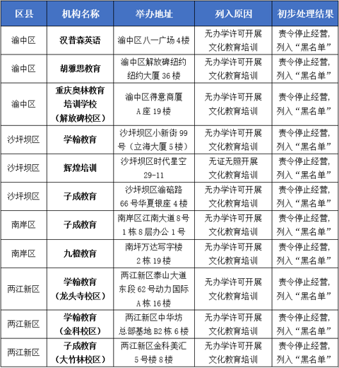 重拳整治!市JW通报!重庆11家校外PXJG涉嫌非法办学