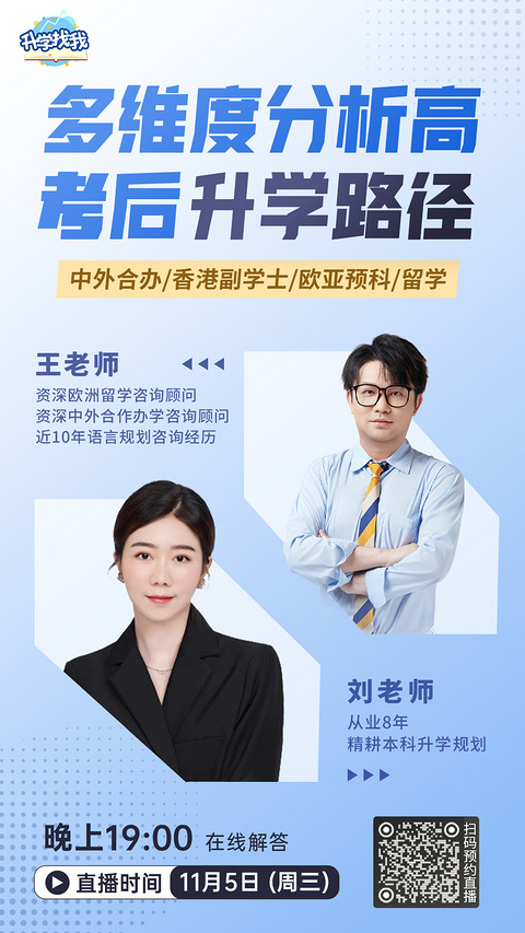 寒窗十二载,一考定乾坤?不,高考从来不是终点,而是通往无数可能的起点!越来越多人正通过多元路径实现升学目标 。 孩子迎战高考,家长是否都有以下顾虑? ?分数在本科线徘徊,还有机会逆袭名校吗? ?动辄数十万留学,有没有高性价比的“黄金跳板”? ?中外合作办学鱼龙混杂,如何识破陷阱选对项目? ?香港/欧洲/亚洲升学路径复杂,哪种才适合我家孩子? 别让信息差,成为你与梦想之间的高墙! 11月5日,在线开
