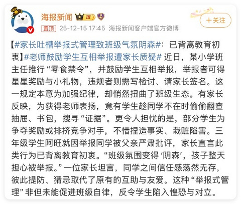 最近,某小学的一位班主任推行“零食禁令”,执行成本高,就鼓励学生互相举报,举报者可以得到小星星奖励,违规者就要写检讨。为了小星星,群体中开始出现积极举报者,先是趁同学不在桌位,偷偷翻同学的书包,接着举报者之间为了互相竞争,开始排挤对手,不惜栽赃陷害和诬告。班级氛围阴森森的。 类似的爆料更多。从小零食到课间奔跑,让小孩子沉寂下去的措施,都可以催生出一项举报。 看着真的无语