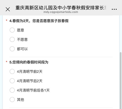 接到学校的调查没有?看来重庆春假是要连着清明节一起放啊成都,江苏的春假也是连着清明,这要是都放在一堆,连着清明不好请假不说了,那机票,酒店也不可能便宜到哪里去的咯。原本还以为5月放春假,还可以带着娃冲一下北京,这样看来,没得机会了[/11尴尬]