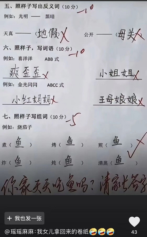 打开孩子的作业本,更像是拆盲盒。你永远不知道里面是答题,还是出题,甚至每一页都可能写着:“老师,惊不惊喜?意不意外?” 有网友 晒出的语文作业题:“请写出‘天真’的反义词”。她家孩子写的是:“地假”。这不光押韵,还成功拓展了汉语新语义边界。 紧接着另一题:“公开的反义词?”答曰:“母关。”全家人一时没反应过来,“母关”?原来孩子理解成了“公开=爸爸开门,母关=妈妈关门”。你说他错吧,好像也不全错,