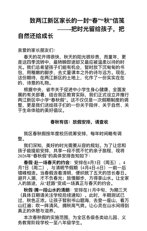 两江新区,春假来啦!针对幼儿园,1到8年级