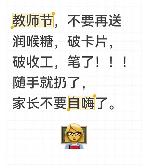每年教师节,说起来不送礼物然而家委会的动作就没有停过今天在没有老师的群,家委会征求意见,说给语数外老师准备礼物,仪式感还是要有选的礼物200多,说起来班费也是集体的,所以来统计大家的意见最后,班上有20来个家长同意了,没表态的剩余家长,直接被代表了……
