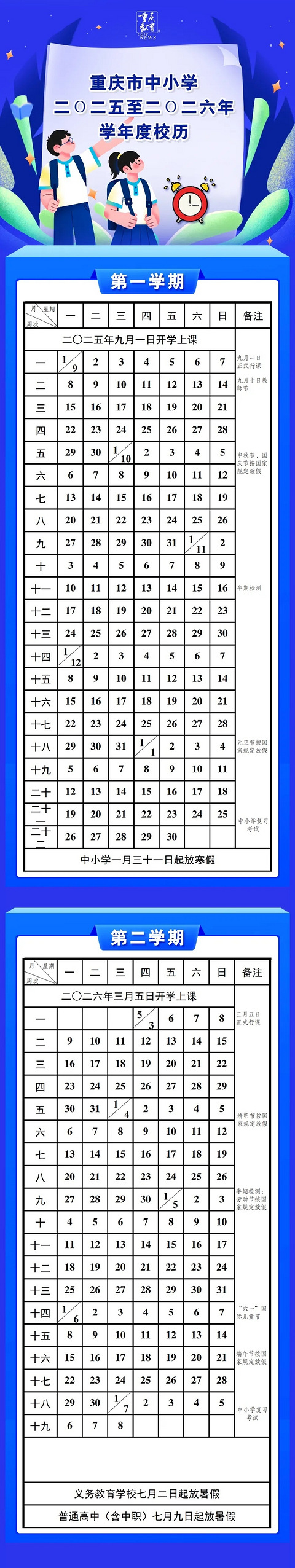 重庆中小学2026年春季学期3月5日开学!暑假时间也出炉