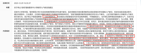 ▍近日,有家长在平台反馈呼吁停止“变相”强制要求中小学教师入户家访 内容如下:目前中小学各年级,每学期至少有1次会安排教师到每位学生家中家访,虽未明确官方表态要求教师必须实现每位学生强制入户家访,但却在实际实施过程中通过内部指令、口头要求、之后统计数据与教师工作绩效挂钩等各种形式,“变相”强制要求教师实现每位学生均入户家访。上述“变相”强制中小学教师入户家访的行政行为,至少有以下错误或弊端:1.违