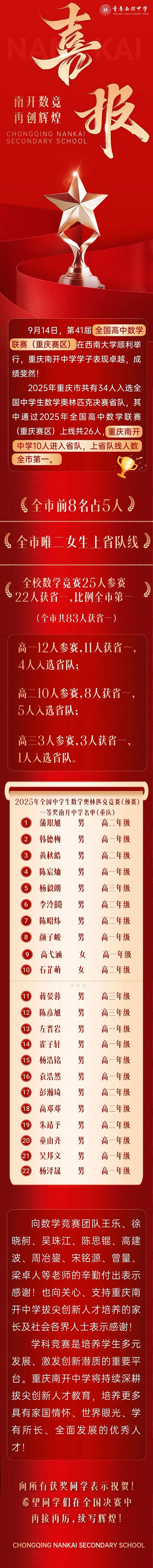 全国高中数学联赛(重庆赛区),南开上省队线人数全市第一