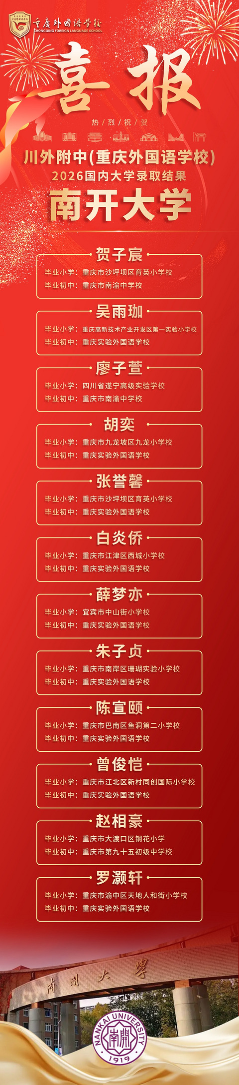 重庆外国语学校2026升学喜报:12名学生保送南开大学!