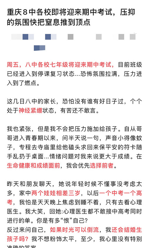 网上刷到一篇八系家长的吐槽就不太能理解这种家长既要还要的心理,当初考这个学校,是你自己的选择吧,都是经历过痛苦的奥数、刷题,到处考试过来现在又来说不会把压力给到孩子,那你进这学校干嘛啊?成绩跟不走,就名校三年游,到时候初升高又来吐槽中考名额少了?联招线高了?娃儿没得书读?进初中的第一次大考就焦虑成这样,只能说人工鸡娃,果然还是走不长远的