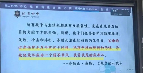 北京四中家长会的PPT引起全网共鸣 不愧是名校,关注的都是当前最尖锐的教育问题。 孩子到了青春期,很多父母还在事事代劳。 家长要学会逐渐放手,否则保护过度,可能会让孩子成为一个畏首畏尾的成年人。 警惕短视频、虚拟网络。 缺乏真实的链接,可能会让孩子社交贫困,长成空心的“四无”青年。 还有别老盯着学习成绩。给孩子的兴趣爱好,留一点空间。 无用之用方为大用,看起来“无用”的东西,才让孩子走得更远。 最