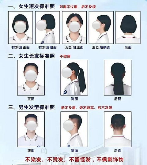 在发型管理这块整体的情况是: 初中比小学和高中严格,男生比女生严格。 部分学校发型要求 大多学校对学生的发型有明确规定,对男生的要求是“发不过指”,且检查严格。 有的学校是通过目测,观察孩子的头发长度;也有学校用更加“吹毛求疵”的检查方式:老师会把手伸进男生头发里量长度,只要头发超过手指尖,哪怕是一毫米,就要求重剪。 对女生的要求则是:披发不过肩,过肩发须扎起来,有刘海必须严格“不遮眉毛”。部分学