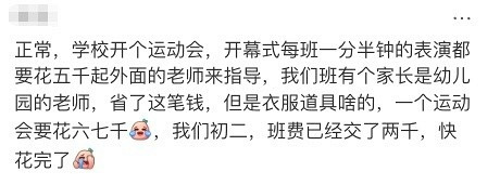 现在的运动会也确实变了味,原本只是一个体育比赛,最后搞成了大型的唱歌跳舞表演,当然花钱也如流水,场地费,服装费、排练费,指导费、乐器费,物料费、标语费等等杂七八了,这些原本都可以不用花的费用,就是为了面子,要壮观、要震撼,要大而全..... 近日,成都一中学家长在“问政四川”平台留言称,10月底学校将召开运动会,每班要进行拳术表演,并要求集体花班费请老师排练,花费在5000元至10000元不等。该