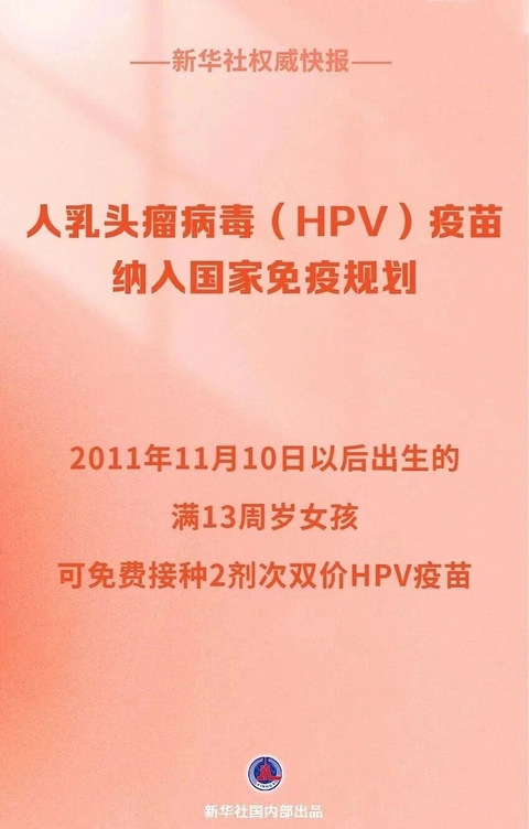 11月10日起,满13周岁女孩可免费接种HPV疫苗