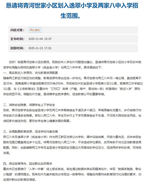 落实就近入学?有小区业主发出请求,将划片从两江中学到两江八中