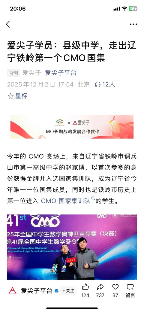 8个月基本自学拿下cmo国集 小镇之神八个月前,赵家博对数学竞赛的真正接触才刚刚开始。当时的目标只是希望能够冲一冲省队,于是从那之后开始正式走进数学竞赛的体系化学习,从最初的自学逐渐进入稳定的训练节奏。从 4 月开始,他正式开始体系化学习,跟随爱尖子的课程进行知识梳理和专题训练。前期在陈晓琨老师的指导课里,他逐步补齐基础,将零散的知识点串成完整系统。