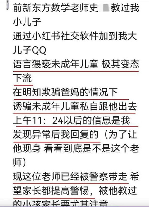 近日,江苏苏州,一位家长发文称,前新东方老师史某在网上约自己11岁的儿子外出,还给儿子发送露骨信息。 新东方相关人士回应此事称,史某今年一月份已辞职,正在核实情况。 另据潇湘晨报报道,家长告诉记者,涉事的陌生男子姓史,现在就职在一所名为中加枫华国际学校。“警察说已经联系过学校了。”孩子妈妈说。 转自沸腾新闻