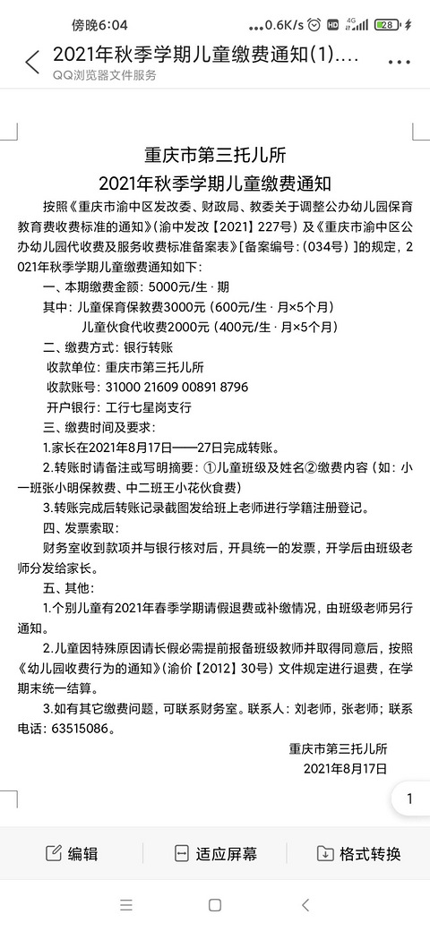 坐标重庆南岸,幼儿园小班,感谢政府感谢党,小区的幼儿园变成了普惠,从1860/月,降到了1200,而且一学期没有算满5个月,所以还不到6000,这一点还是比较厚道。