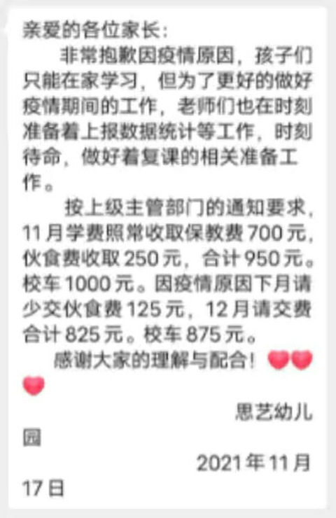 “孩子半个月没去幼儿园,但是学校只退了半个月的餐费,拒绝退半个月的保教费用!”近期,有家长向重庆网络问政平台反映幼儿园停课却足额收取保教费一事。 课程减半费用不减 家长告诉问政平台,自家小孩上的私立幼儿园,保教费和伙食费是按月交的。11月份停课半个月,11月17日收到学校通知,需要足额缴纳停课期间的保教费700元和伙食费125元(由原来的250元减半)。家长不解,既然学校没有上课,为何还要收取这期