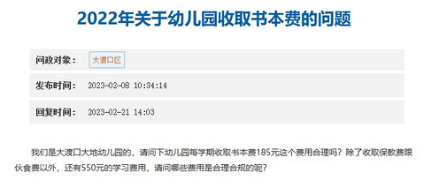 “大渡口大地幼儿园每个月除了要收保教费和生活费外,还要收取书本费和学习费,其他幼儿园都没有收,是否合理?” 近日,家住大渡口的袁女士向华龙网重庆网络问政平台反映,孩子在大渡口大地幼儿园就读,幼儿园每学期收取书本费185元,还有550元的学习费用,请问费用是否合理? 来自:重庆网络问政