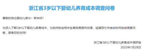 中国基金报 泰勒 每个月补贴1000块钱,你愿意生二胎/三胎吗? 这个春节,浙江省卫生健康委在做一份调查——《浙江省3岁以下婴幼儿养育成本调查问卷》,问卷显示,此次调查是为深入了解三岁以下婴幼儿养育成本,为政府制定相关生育政策提供支撑。