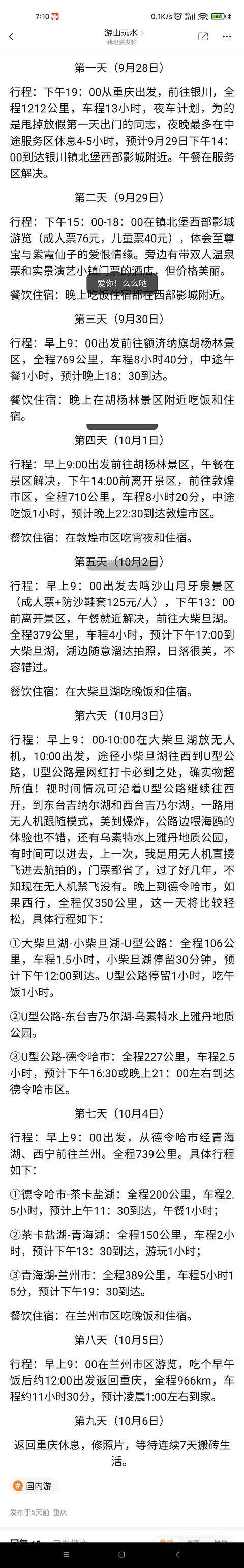 很久没上这个软件了,又是双节出行的好时机!有没有哪些小伙伴走西北环线的约着一起呀,人多热闹。