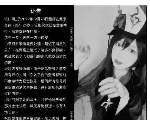 1月9日,网红依川川的男友“空瞳羽梦”发布讣告称:衣川川于2022年12月28日就因病在北京去世,享年只有24岁。后由依川川男友为依川川保管账号。