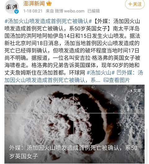 说下汤加最新情况! 汤加副首相宣布:国家进入紧急状态,该国通讯依然处于中断状态。 火山喷发造成的首例死亡确认!