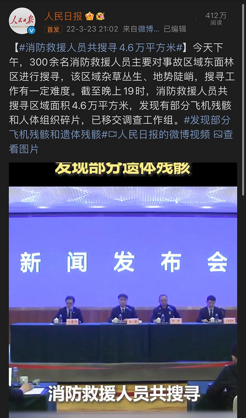 消防救援人员共搜寻4.6万平方米,今天下午,300余名消防救援人员主要对事故区域东面林区进行搜寻,该区域杂草丛生、地势陡峭,搜寻工作有一定难度。 截至晚上19时,消防救援人员共搜寻区域面积4.6万平方米,发现有部分飞机残骸和人体组织碎片,已移交调查工作组。