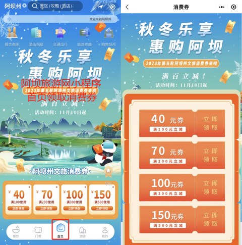 之前分享了西藏景区、黄山、江苏连云港多景区、河北赵州桥景区、四川资阳安岳、张家界大峡谷、福建武夷山等多个景区免票的信息九寨沟火车20号开通?景区优惠季来了,这些地方都免票了 今天来分享下消费券的信息,要出去玩的可以提前领好 11月10日-12月10日,阿坝旅游网官方小程序每日限量发放阿坝州文旅消费券,消费券面额分别为满100元减40元、满200元减70元、满300元减100元、满500元减150元