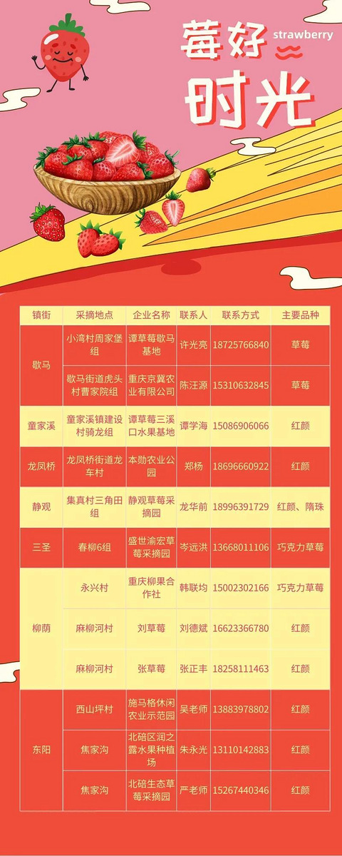 重庆舒适短暂的春光,一定要出门踏青! 这个时节,除了赏花,还有草莓可以新鲜采摘。北碚区就有很多草莓园可供大家选择, 采摘价格30-60元不等,趁着周末,带上家人,一起去享受采摘的乐趣。