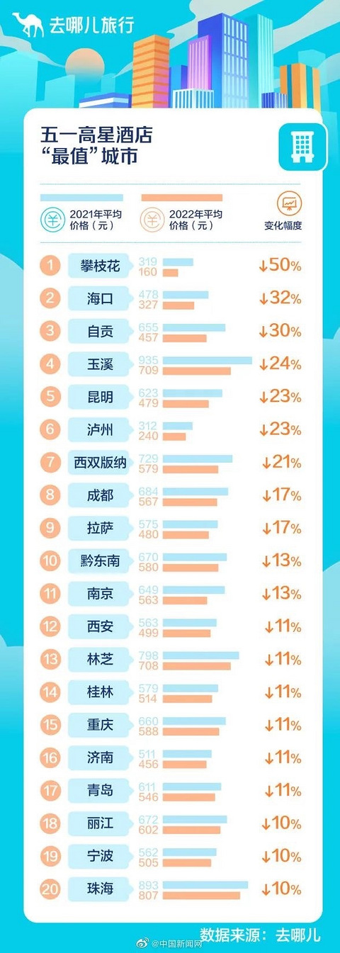下周就是五一了,各平台的一些预订数据也出来了 去哪儿发的数据,各地酒店价格简直惨不忍睹! 高星酒店中,攀枝花、海口、自贡、玉溪、昆明等城市的平均价格,创下近五年同期新低 降幅最大的攀枝花,直接降了一半 转自E旅行网