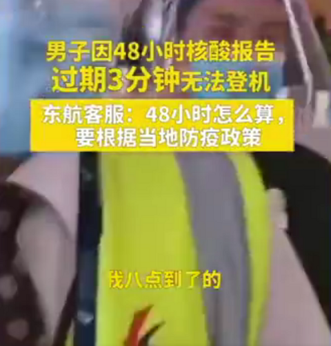 6月15日,@健康时报发布一段视频显示,一男子因为48小时核酸检测报告过期3分钟而无法登机,该男子质疑服务人员不通情理。大家觉得查验核酸证明该不该争分夺秒? 东航客服对此回应:48小时是从旅客核酸采样时间至航班落地时间,因航班延误导致核酸证明过期是无法登机的。
