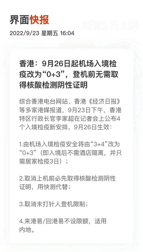 香港:9月26日起机场入境检疫改为“0+3”,登机前无需取得核酸检测阴性证明