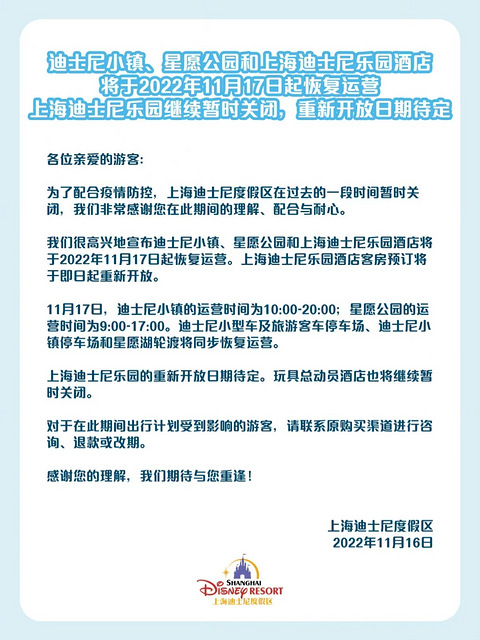11月16日,上海迪士尼公众号发文表示:我们很高兴地宣布迪士尼小镇、星愿公园和上海迪士尼乐园酒店将于2022年11月17日起恢复运营。上海迪士尼乐园酒店客房预订将于即日起重新开放。11月17日,迪士尼小镇的运营时间为10:00-20:00;星愿公园的运营时间为9:00-17:00。迪士尼小型车及旅游客车停车场、迪士尼小镇停车场和星愿湖轮渡将同步恢复运营。上海迪士尼乐园的重新开放日期待定。玩具总动员