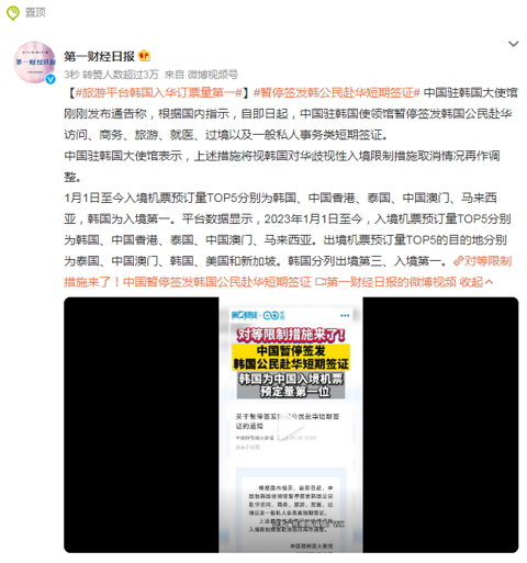 中国驻韩国大使馆刚刚发布通告称,根据国内指示,自即日起,中国驻韩国使领馆暂停签发韩国公民赴华访问、商务、旅游、就医、过境以及一般私人事务类短期签证。 中国驻韩国大使馆表示,上述措施将视韩国对华歧视性入境限制措施取消情况再作调整。 1月1日至今入境机票预订量TOP5分别为韩国、中国香港、泰国、中国澳门、马来西亚,韩国为入境第一。平台数据显示,2023年1月1日至今,入境机票预订量TOP5分别为韩国、