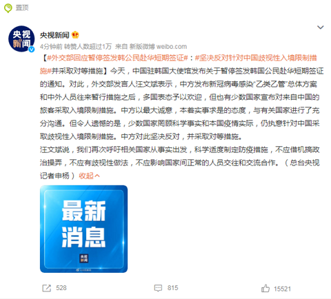 今天,中国驻韩国大使馆发布关于暂停签发韩国公民赴华短期签证的通知。对此,外交部发言人汪文斌表示,中方发布新冠病毒感染“乙类乙管”总体方案和中外人员往来暂行措施之后,多国表态予以欢迎,但也有少数国家宣布对来自中国的旅客采取入境限制措施。中方以最大诚意,本着实事求是的态度,与有关国家进行了充分沟通。但令人遗憾的是,少数国家罔顾科学事实和本国疫情实际,仍执意针对中国采取歧视性入境限制措施。中方对此坚决反