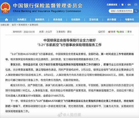 据中国银行保险监督管理委员会网站,“3·21”东航飞行事故相关保险公司都已做好赔付准备工作,在合同责任范围内,应赔尽赔快赔。截至3月29日,财产保险方面,承保飞机机身的人保财险、太保财险、平安财险、国寿财险合计向东方航空公司预付保险赔款1.16亿元。 人身保险方面,相关保险公司根据客户报案情况,积极开展保险理赔工作,目前已有11家公司向遇难人员家属支付14笔赔款,金额合计1485万元。