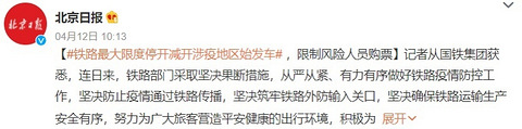 近期,乘火车,从疫情严重地区出发导致某地排查的消息不断。 国铁集团昨日表示,近期最大限度停开减开涉疫地区始发车,限制风险人员购票,最大限度减少疫情通过铁路外溢风险。