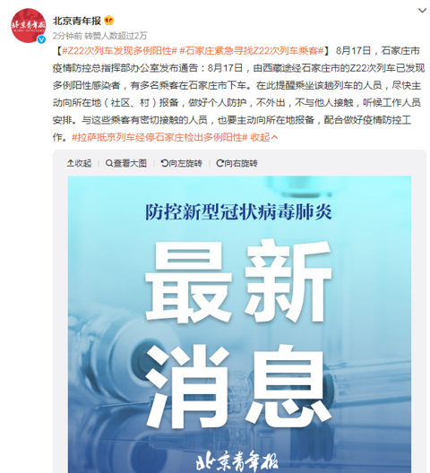 Z22次列车发现多例阳性,石家庄紧急寻找Z22次列车乘客 8月17日,石家庄市疫情防控总指挥部办公室发布通告: 8月17日,由西藏途经石家庄市的Z22次列车已发现多例阳性感染者,有多名乘客在石家庄市下车。在此提醒乘坐该趟列车的人员,尽快主动向所在地(社区、村)报备,做好个人防护,不外出,不与他人接触,听候工作人员安排。与这些乘客有密切接触的人员,也要主动向所在地报备,配合做好疫情防控工作
