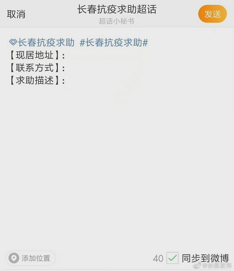为帮助长春网友解决疫情下遇到的各种困难,长春发布联合微博已在长春抗疫求助超话内开通长春抗疫求助通道。 有实际困难的长春市民可以在长春抗疫求助超话内,可按照图片指引,带长春抗疫求助话题词,发布求助信息。 @长春发布及平台抗疫专项团队将及时对有效求助帖进行汇总,帮助大家解决困难,携手同心战胜疫情!