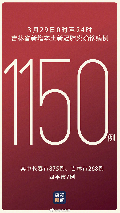 据国家卫健委消息,3月29日0—24时,吉林省新增1150例本土确诊病例,其中长春市875例、吉林市268例、四平市7例;新增本土无症状感染者1032例,其中吉林市680例、长春市348例、四平市2例、辽源市1例、白城市1例。