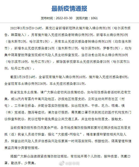 2022年3月29日0-24时,黑龙江省新增新冠肺炎境外输入确诊病例1例(哈尔滨市报告,韩国输入),另有境外输入无症状感染者转确诊病例2例。 新增本土确诊病例3例(佳木斯市2例,哈尔滨市1例),另有本土无症状感染者转确诊病例13例(均在佳木斯市),新增本土无症状感染者24例(佳木斯市17例,哈尔滨市6例,伊春市1例),均为集中隔离管控筛查发现或对风险人员主动排查发现。当日治愈出院本土确诊病例20例