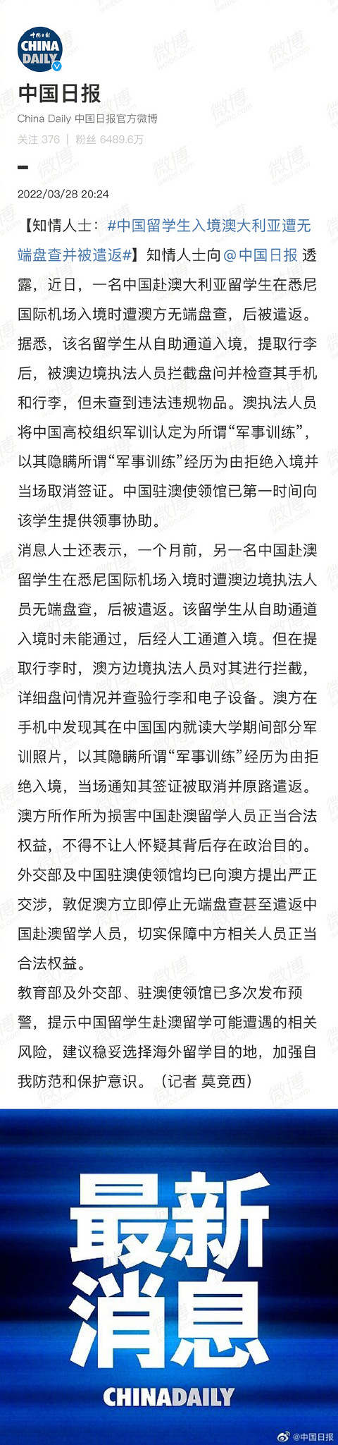 知情人士向中国日报透露,近日,一名中国赴澳大利亚留学生在悉尼国际机场入境时遭澳方无端盘查,后被遣返。 据悉,该名留学生从自助通道入境,提取行李后,被澳边境执法人员拦截盘问并检查其手机和行李,但未查到违法违规物品。澳执法人员将中国高校组织军训认定为所谓“军事训练”,以其隐瞒所谓“军事训练”经历为由拒绝入境并当场取消签证。中国驻澳使领馆已第一时间向该学生提供领事协助。 消息人士还表示,一个月前,另一名