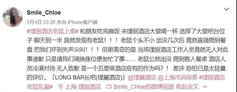 1月4日晚,网友@Smile_Chloe 发微博称,当晚和朋友在静安区五星级酒店,璞丽酒店吧台聊天时,发现有一只“个头不小”的老鼠直接爬到餐盘上。 转自旅行雷达、e旅行网、新浪微博等